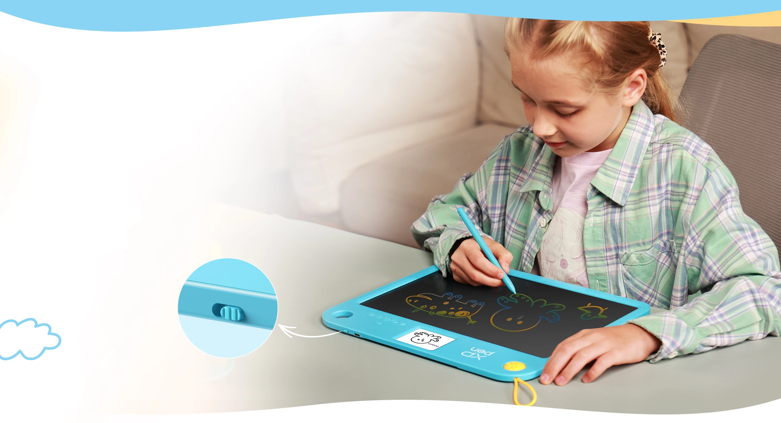 The lock protection switch is located at the top right of the learning board. When switched on, the clear function is disabled, preventing accidental erasure and helping children focus on their creations.