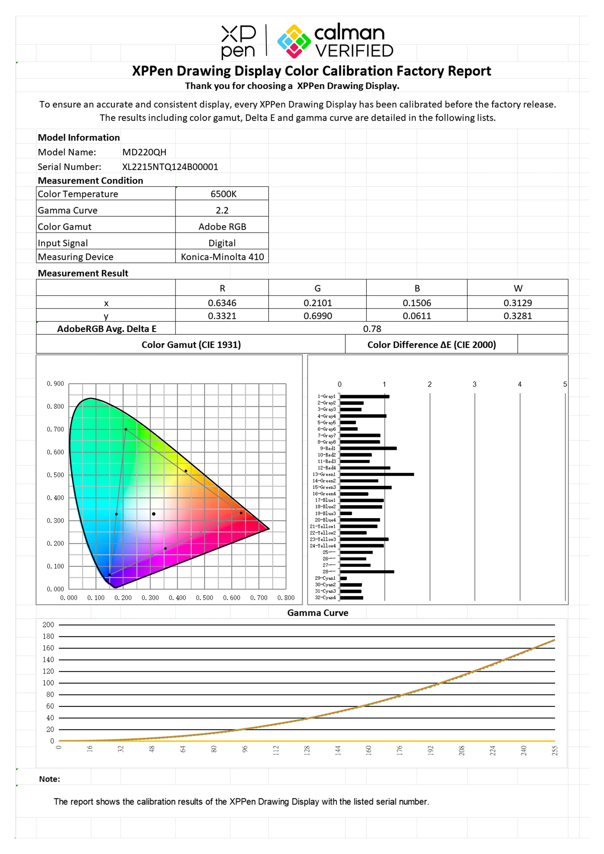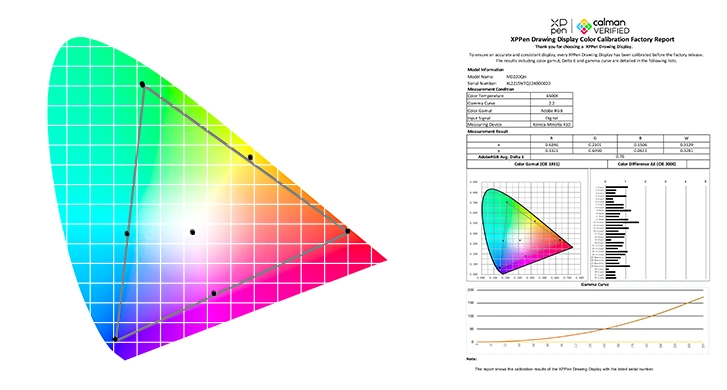 Artist Pro 22 (Gen 2) drawing display has obtained Calman verification, representing its color accuracy is recognized by authority organization. Each Artist Pro 22 (Gen 2) undergoes rigorous calibration and testing using a 3D LUT stereoscopic space to ensure color accuracy. Moreover, every display comes with its own Calman verified report.