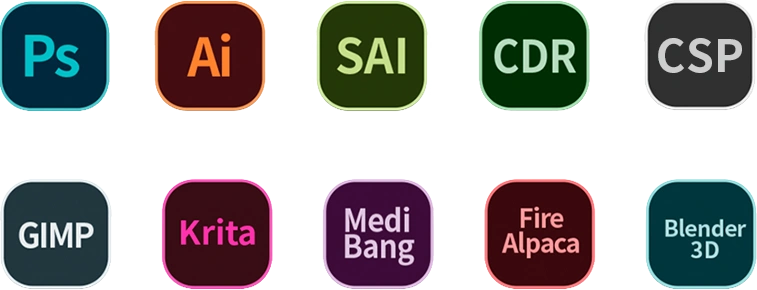 Compatible with popular digital art software such as Adobe Photoshop, Illustrator, SAI, CDR, Clip Studio Paint, GIMP, Krita, MediBang, FireAlpaca, Toonboom, Maya, and Blender3D, etc.