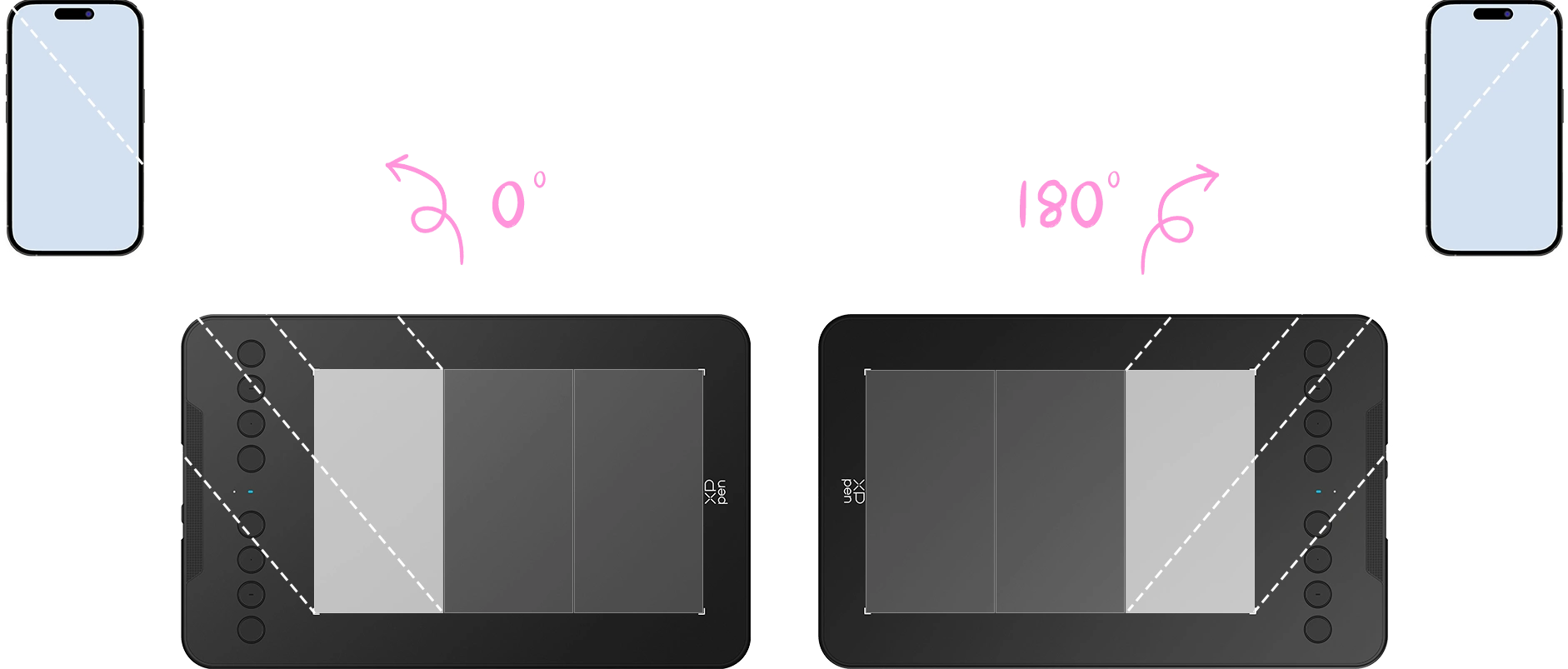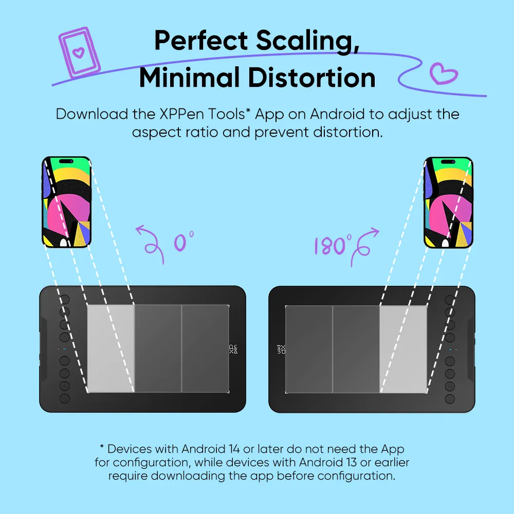 Download the XPPen Tools App* on your Android device to manually adjust the aspect ratio and prevent image distortion. You can also rotate the tablet 180° to accommodate both left- and right-handed use.