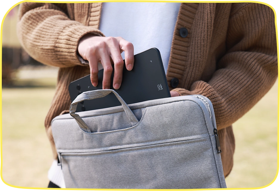 It weighs just 336g and is under 9mm thick, making it as slim as a smartphone. You can easily pack it into your bag and start creating anywhere.